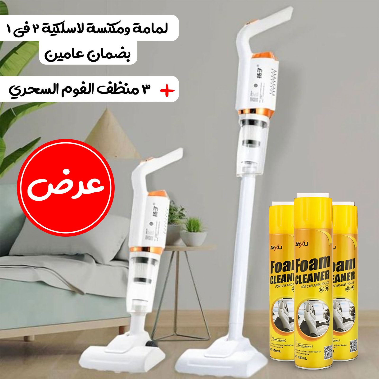 عرض لمامة ومكنسة لاسلكية 2 في 1 بضمان عامين مع ٣ منظف الفوم السحري